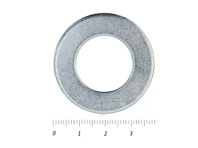 Стандартная плоская шайба DIN 125 служит для фиксации резьбовых соединений. Представляет собой плоский диск с гладким цилиндрическим отверстием в центре для установки винта, болта или другого метрического элемента. За счет своей формы увеличивает площадь прижатия головки винта или гайки к поверхности заготовки. Используется при необходимости исключить произвольное раскручивание винта, к примеру, под воздействием вибрационных нагрузок. Также плоская шайба исключает продавливание материала при чрезмерном затягивании винта. Основную нагрузку принимает на себя шайба, поэтому поверхность установки не подвергается деформации.